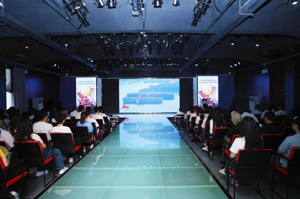 在5号楼401室设立集中观看会场,学院领导班子成员、全体教师和学生党员等百余人齐聚会场,全程观看盛大阅兵活动。